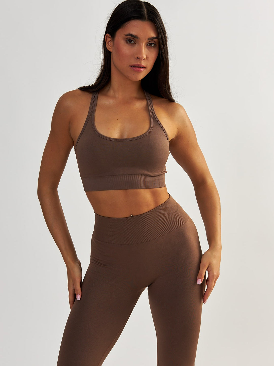 Forsiden af toppen er syet af et dobbelt lag stof, hvilket sikrer en effekt af "ingen gennemsigtighed" er garanteret 100%.Den har også udtagelige forstærkende indlæg, push-up, som giver støtte under fysisk aktivitet og optisk former og forstørrer brystet.