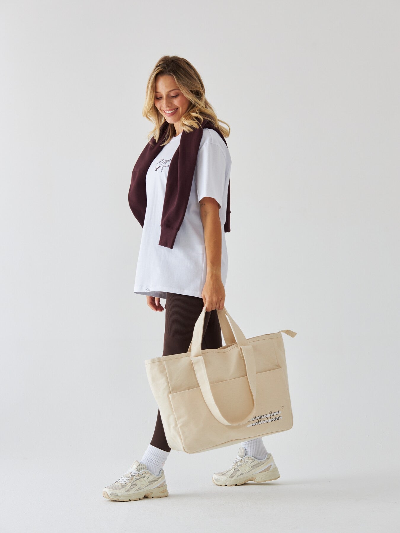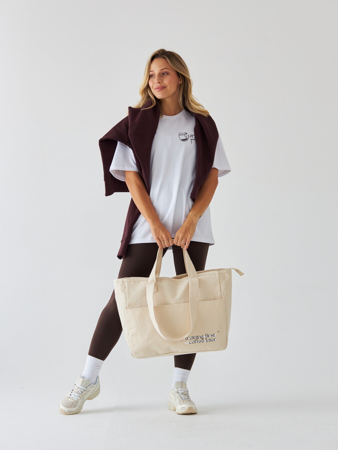 42 × 37 × 15 cm – zmieścisz ubrania treningowe, bidon, notebook i oczywiście — latte. Wszystko gotowe na Twoje zasady. Zamykana na zamek, 2 kieszenie z przodu. Wyprodukowana w Polsce.