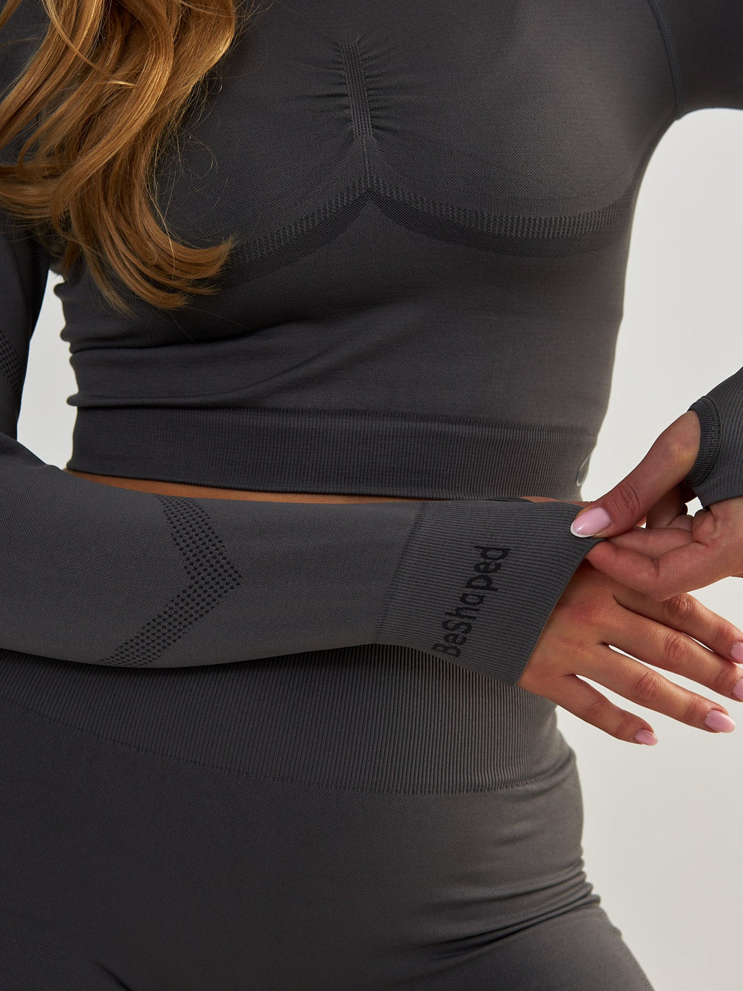 De lange mouwen zijn voorzien van een opening voor de duim, zodat je ze over je hand kunt trekken. Bovendien hebben we de mouwen afgewerkt met een delicate ribbing met een jacquard, decoratieve afwerking.
